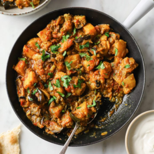 - Stir in the pan-fried eggplant and continue to cook for another 15-17 minutes, stirring occasionally. If needed, add water to prevent sticking.