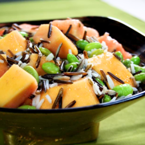 2. Put the papaya chunks into a salad bowl along with the rice and cooled soya bean mixture. Add salt, pepper, and lime juice and toss well. Taste and add more salt, if needed.
