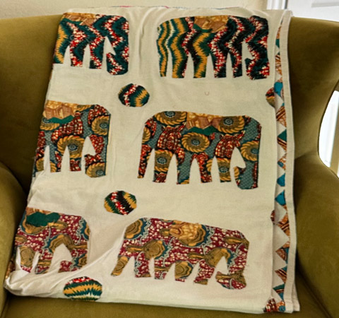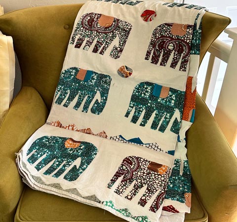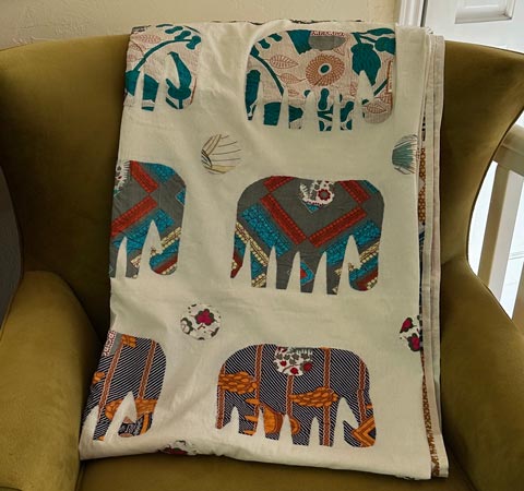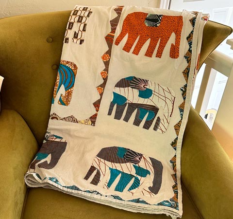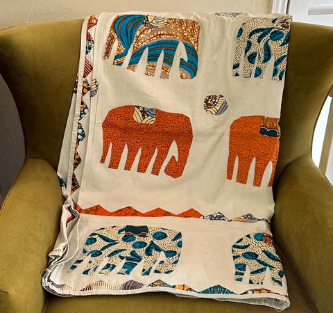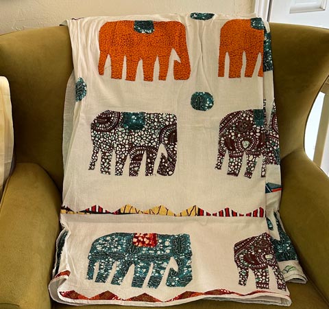 Blankets are approximately 100″x 80″ for a full or queen bed. The full/queen blankets are medium weight and the elephants are hand-embroidered.