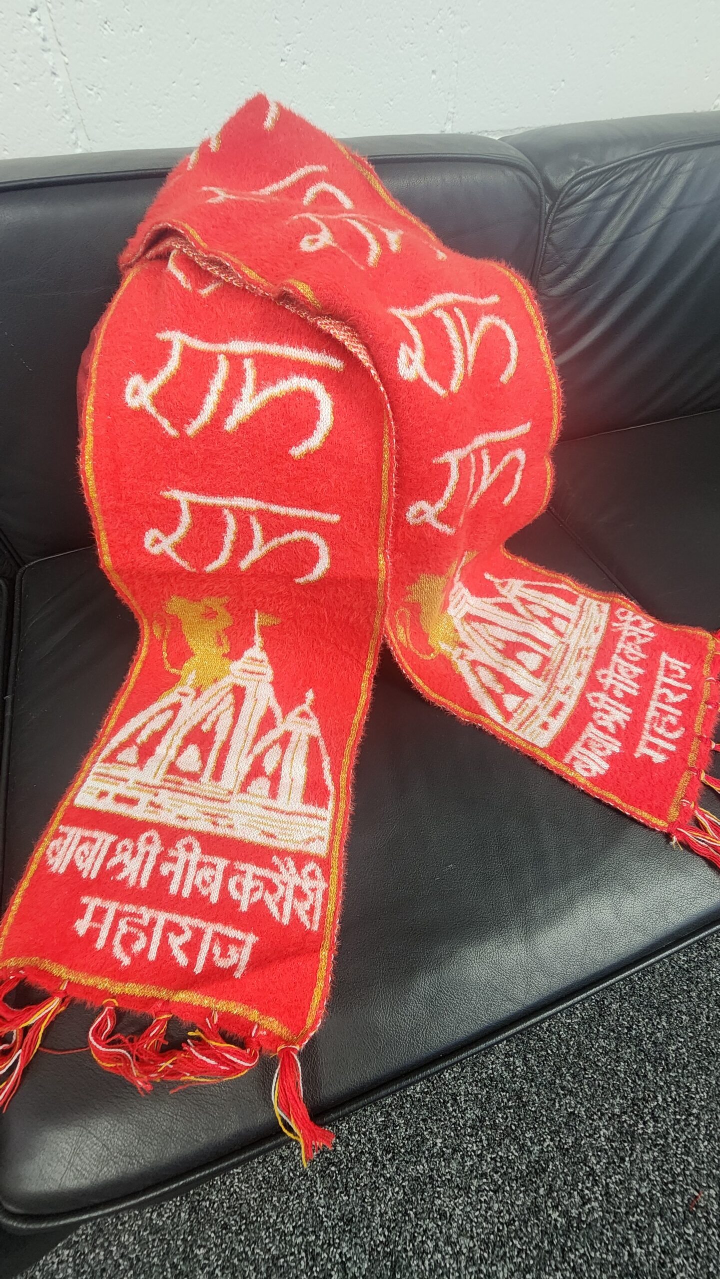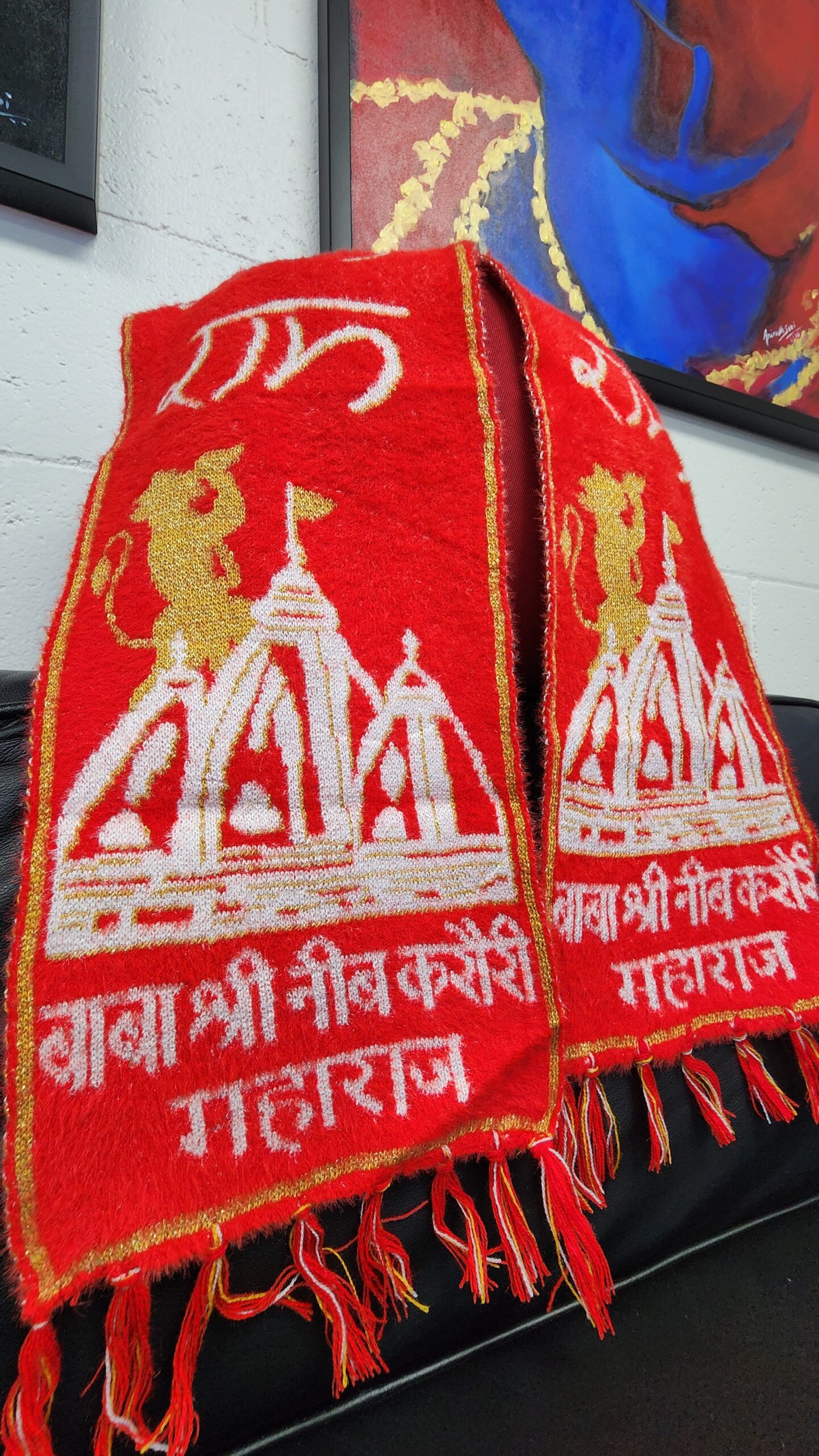 Vibrant and full of life, this handcrafted red scarf celebrates the spirit of devotion through the Ram Ram script and the sacred image of Kainchi Dham. Infused with ittra/attar, a natural essence used for centuries in Indian spiritual practice, this piece is both grounding and uplifting—a perfect companion for meditation or daily wear.