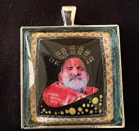 Donate $30 and receive this elegant and meaningful hand-crafted Neem Karoli Baba pendant. A soft sea green border encloses a row of yellow and red triangles in a classic Indian design style.