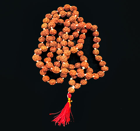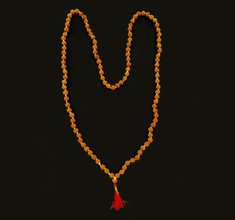 One hundred eight rudraksha beads with knotted yellow thread and red tassel. An elegant addition to your puja table and for use while chanting mantras. They will darken over time with handling.